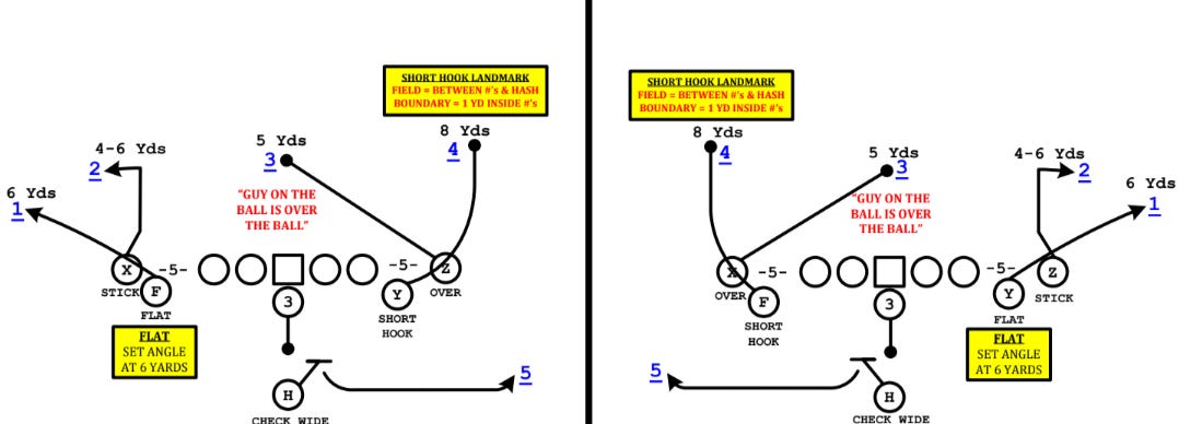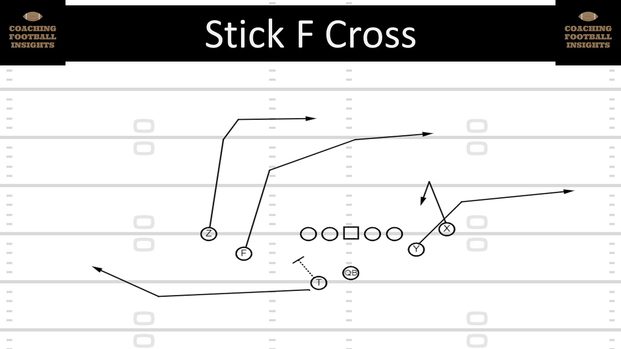 Stick is a simple hitch and flat combination. The tagged receiver, runs a 5-yard hitch route, aiming to split the difference between the flat and the hook defender.