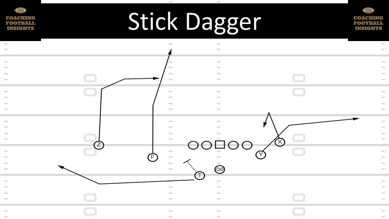 Here they take that same concept and put it on the backside of Stick. Just like with Cross, the depth of the Dagger routes allows for Love to quickly throw the stick combination or reset his feet and work the Post, to the Dig, to the Flat route.