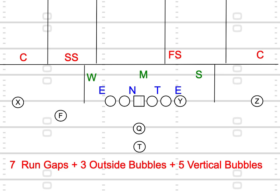 An offense in most situations (unbalanced ineligibles excluded) has 5 potential vertical threats on any given play creating 5 vertical bubbles.