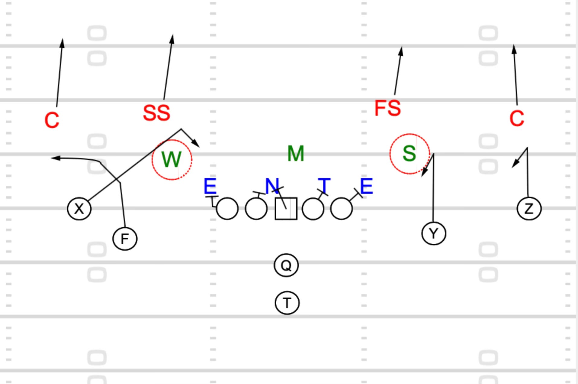 The safeties align on the inside eye of number two with a flat-foot read. No backpedal. They’re reading run or pass through their keys. Versus run, they fill downhill. Versus pass, they’re responsible for the vertical release from number two. If number two doesn’t threaten inside vertically, the safety brackets number one outside, looking for the curl, dig, or post.