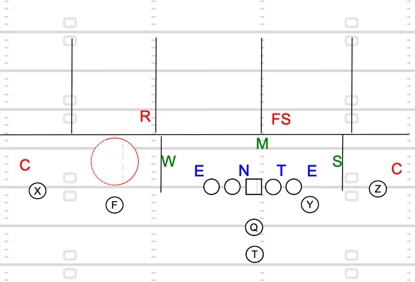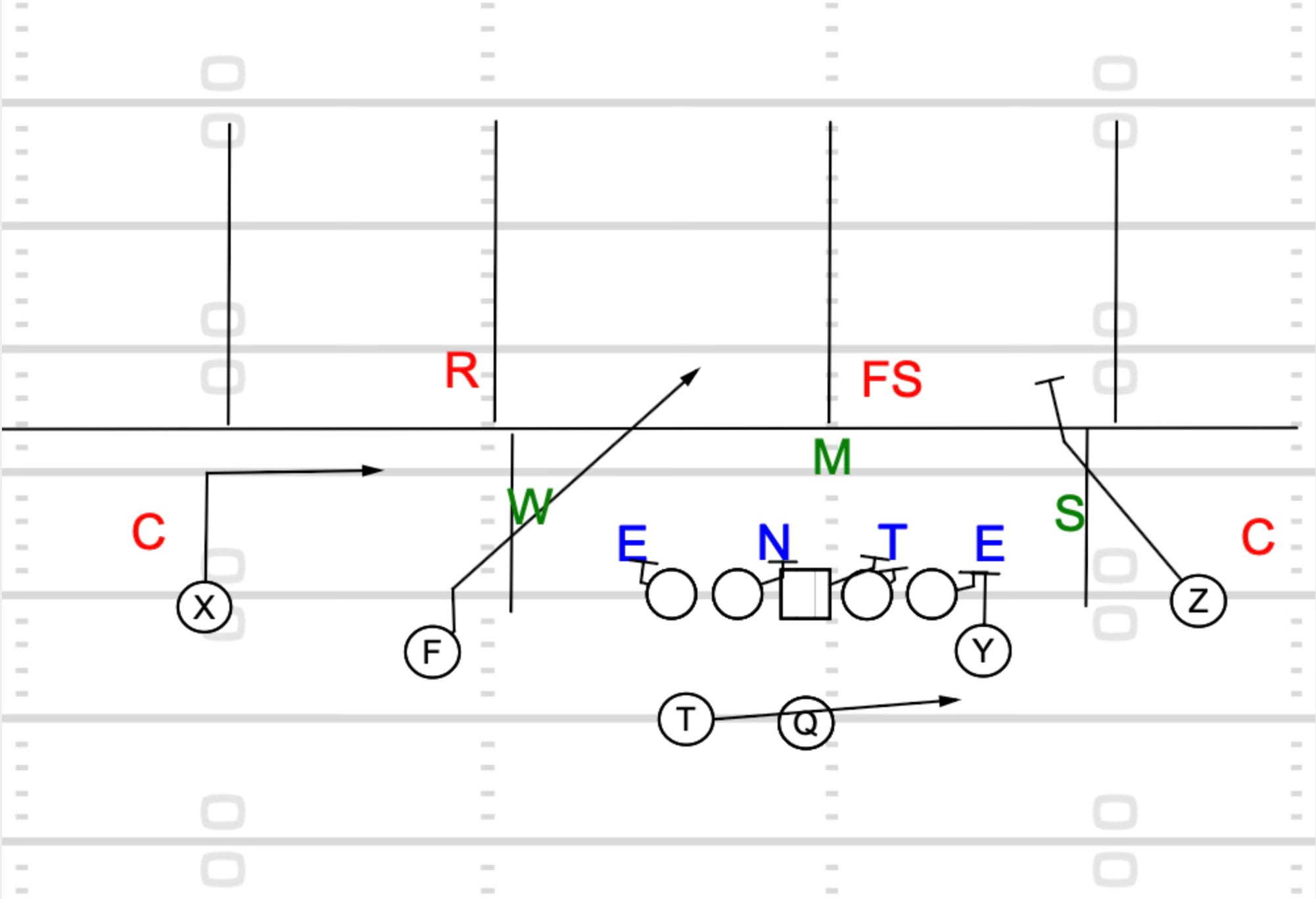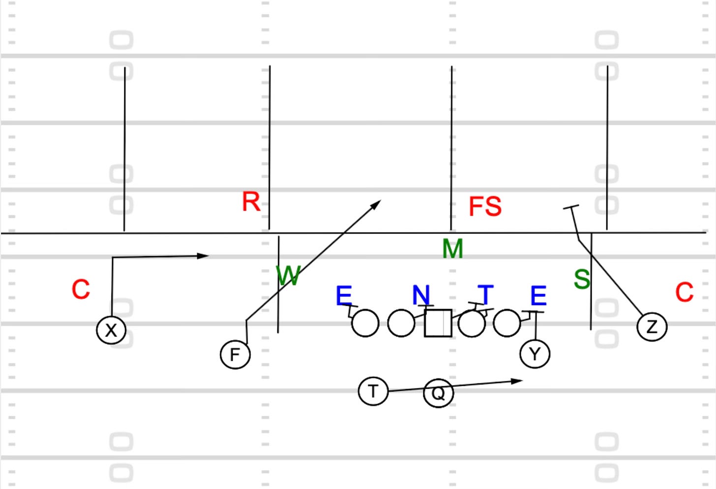 Fin Route: The outside receiver doesn’t run a true slant. He runs what we call a Fin. Five yards and work flat. The angle is different, but it attacks the same void.