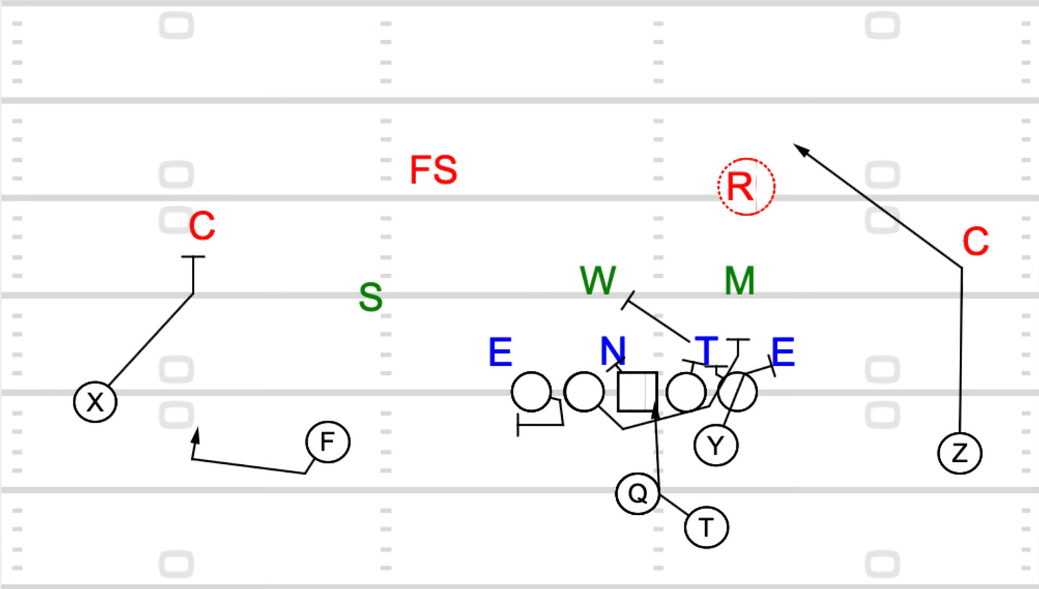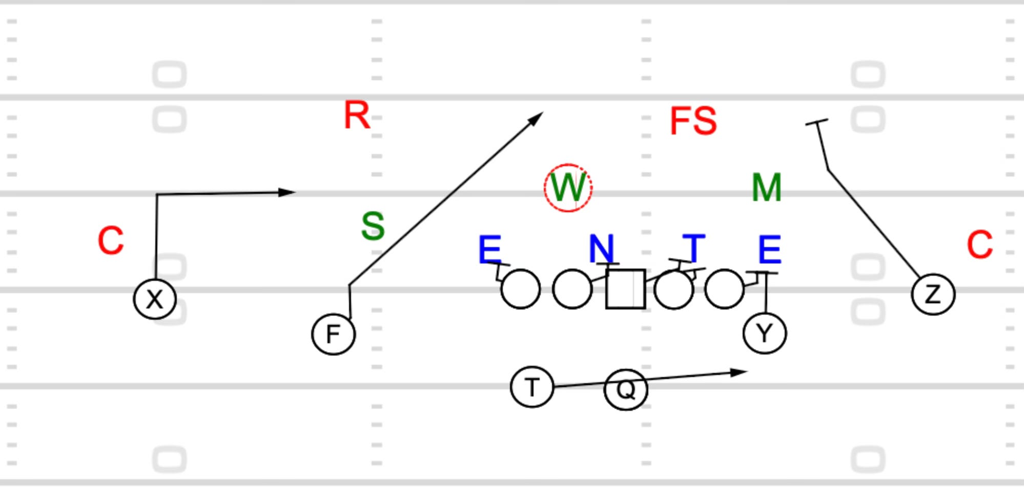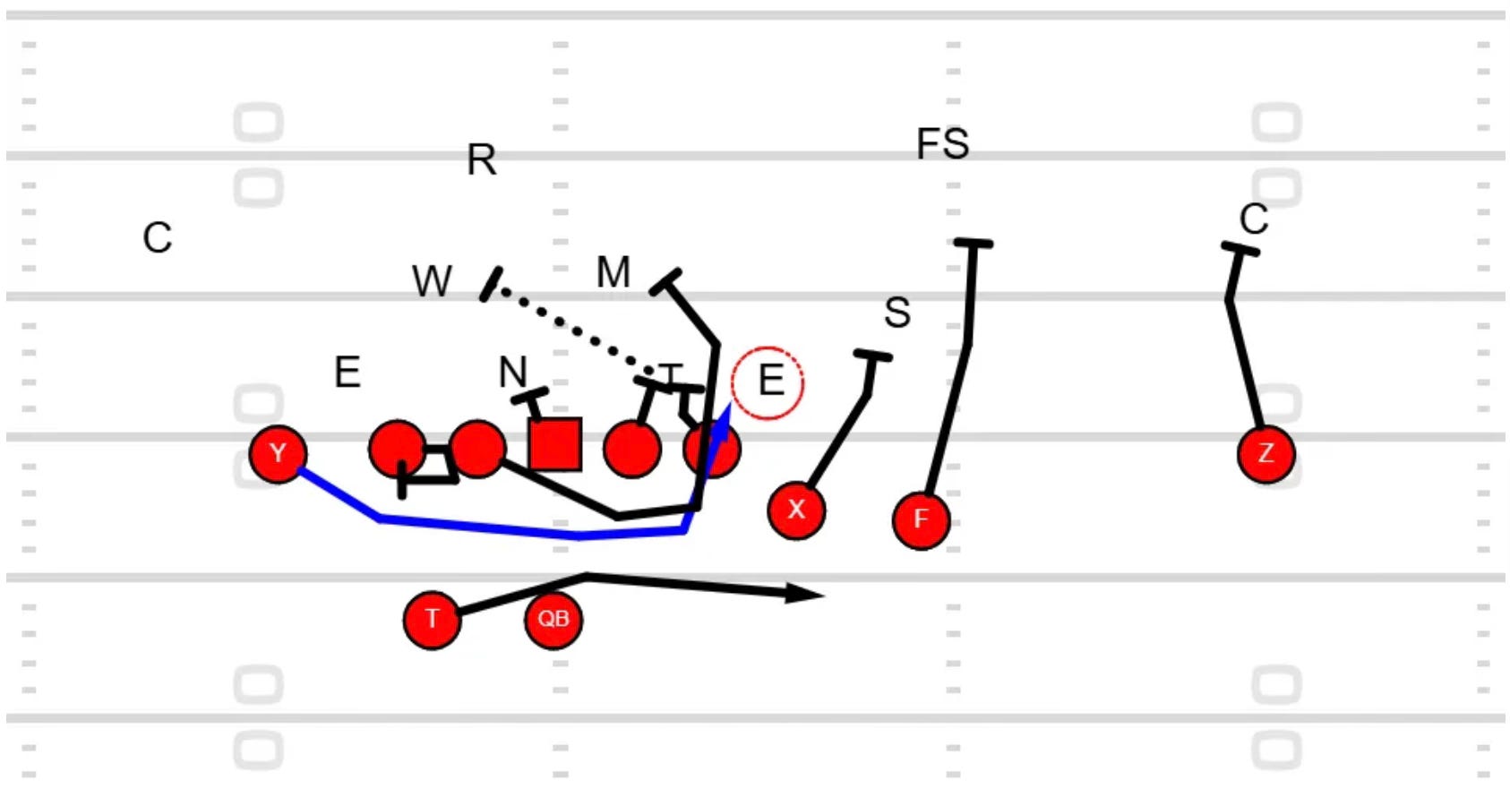 The goal is to attack that linebacker’s pass responsibility. If he fits the run, there’s a route sitting right in the space he just vacated. Common combinations are inside zone with a stick route or wide zone with backside slants.