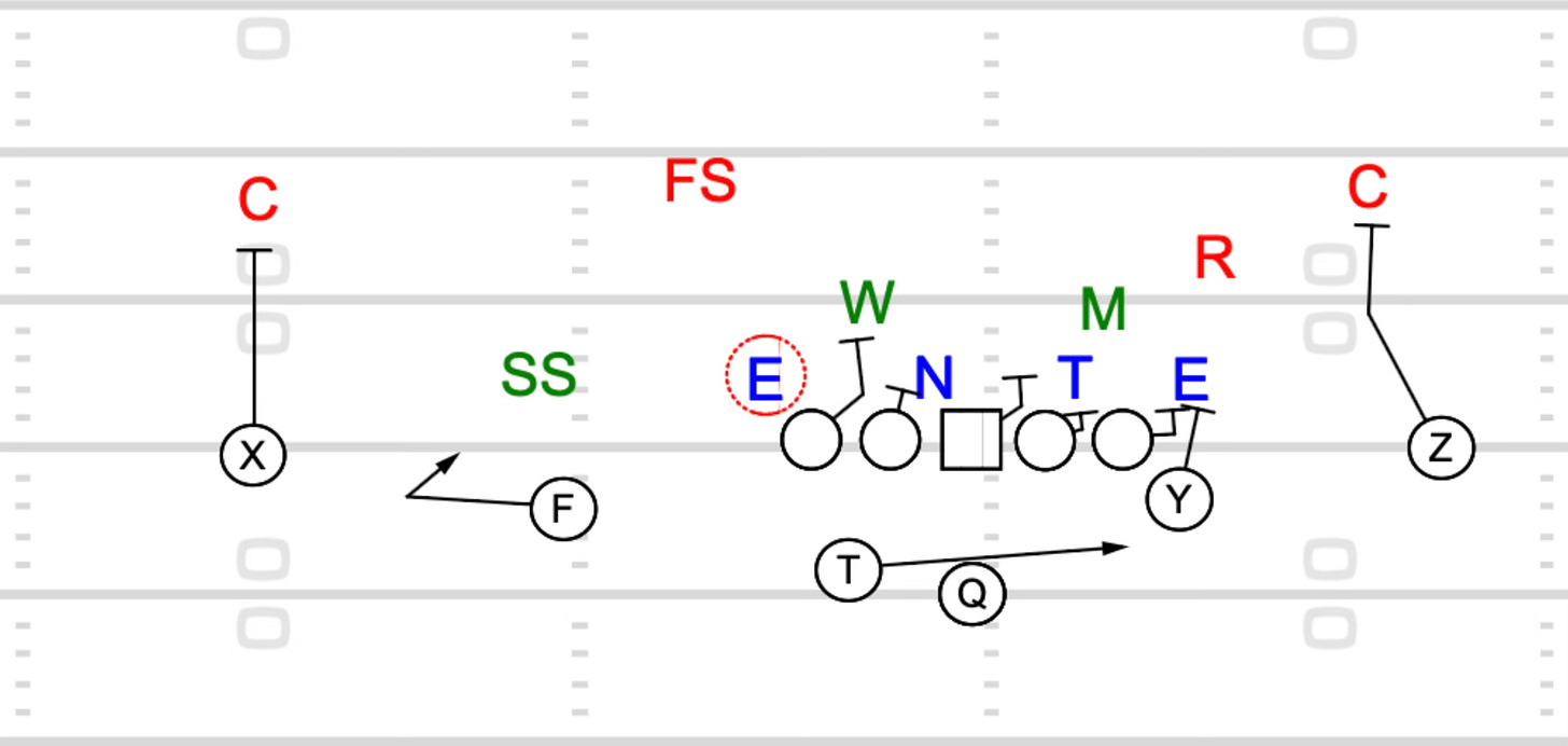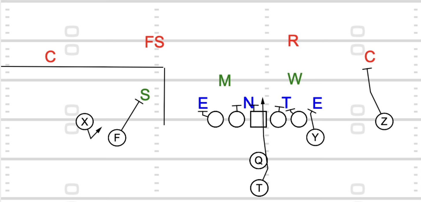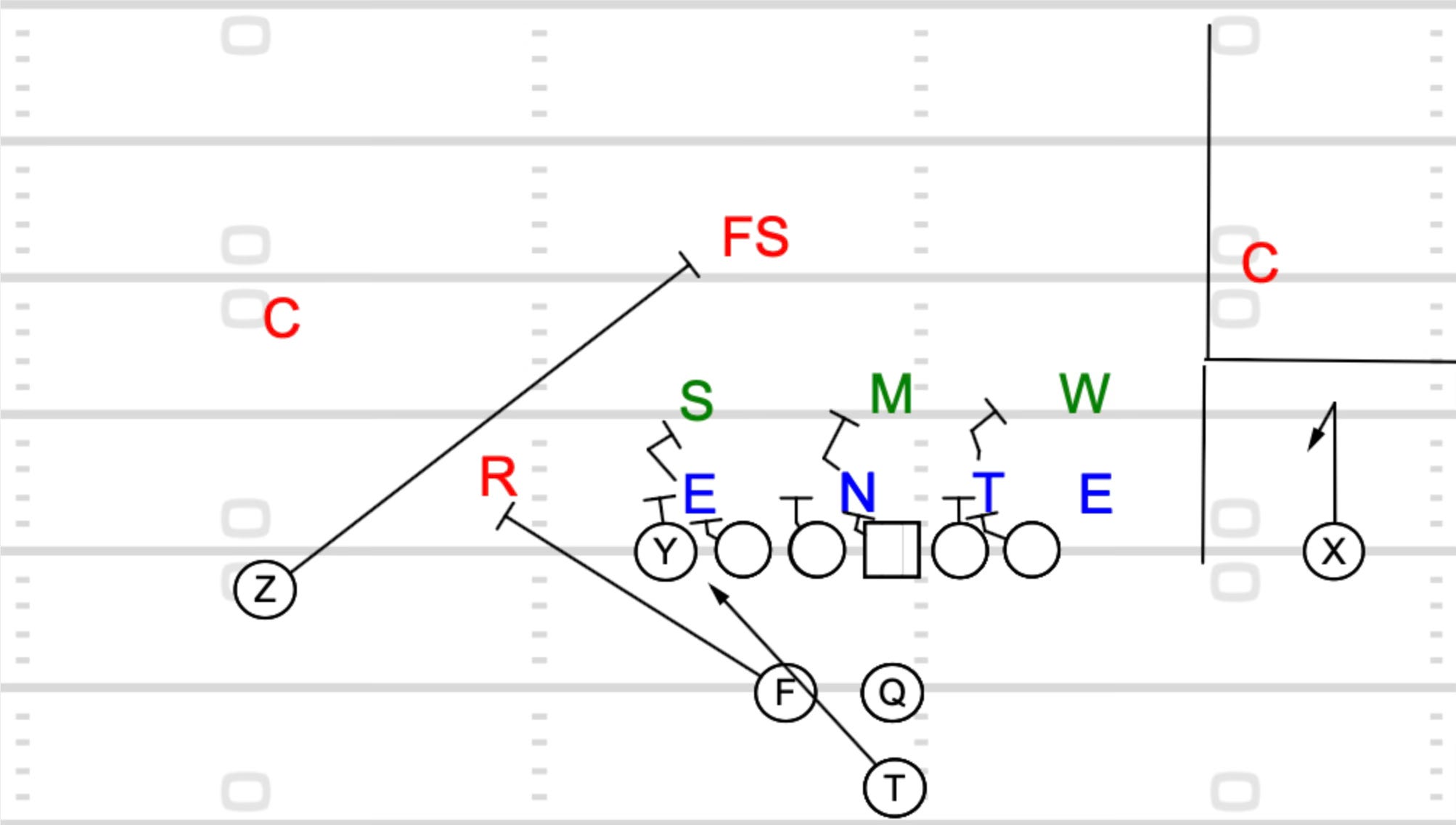 The offensive line accounts for every defensive lineman. The quarterback reads a second-level defender, usually the backside linebacker away from the run, after the snap.