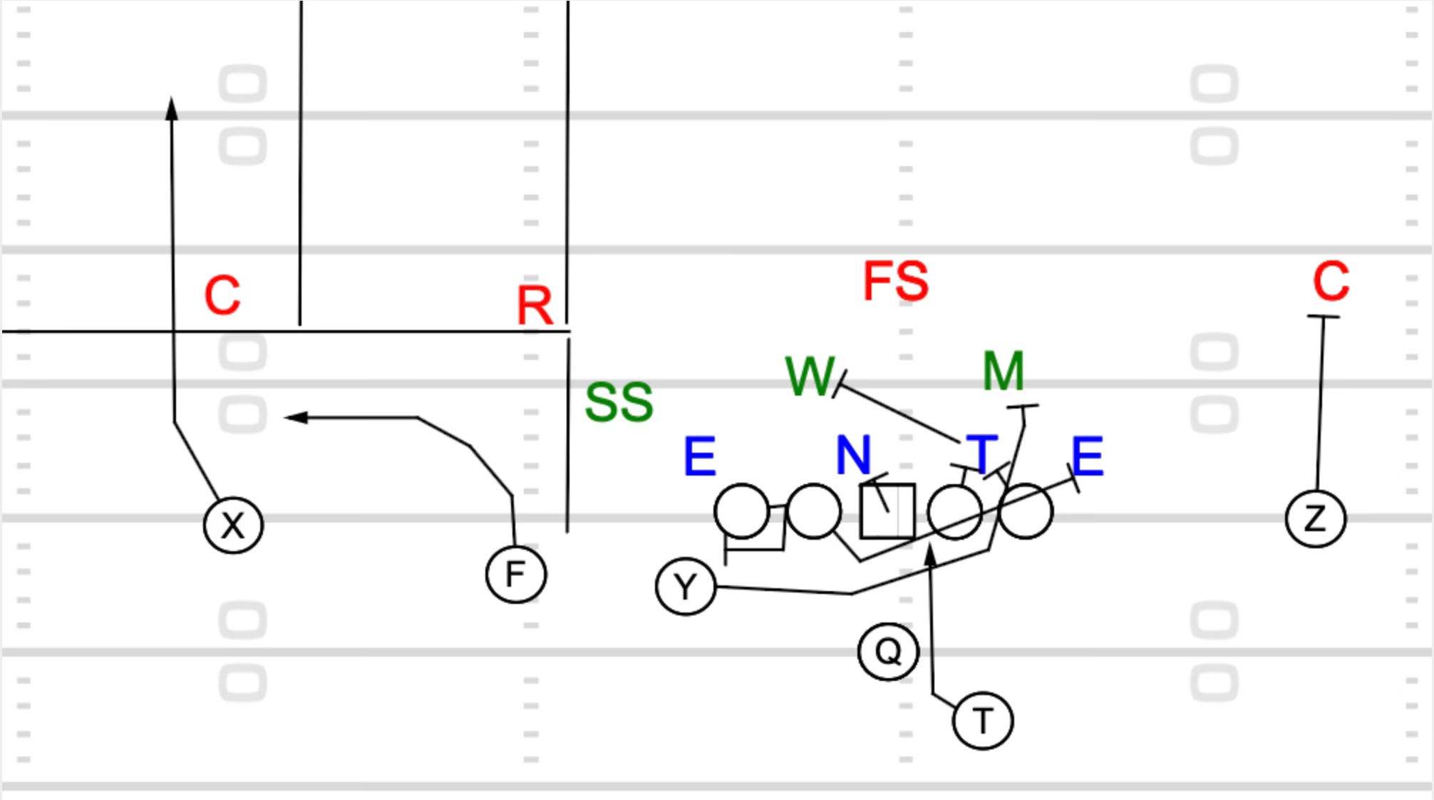 The difference from triple option: instead of a pitch back, you have a route or a screen.