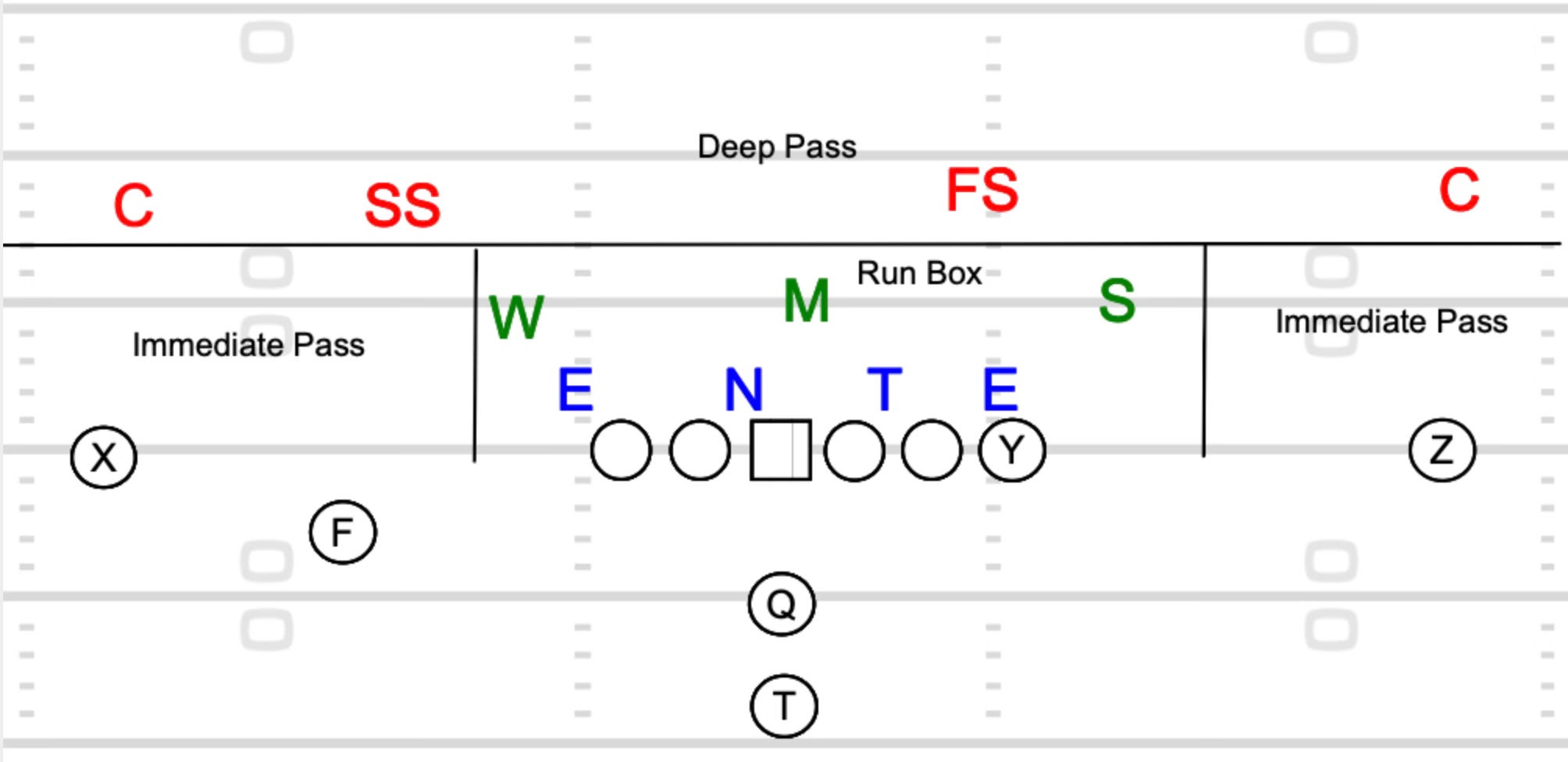 The run box is the area between the apex of the furthest inside receiver on each side of the formation and the offensive line. This is where run defenders live. If a defender is in this box, he’s a run threat.