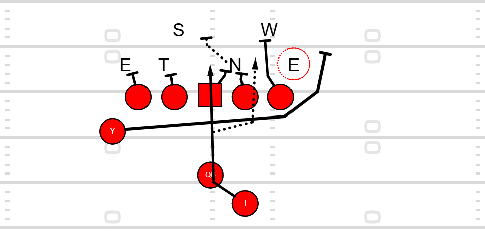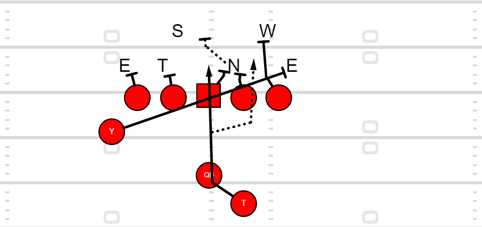 The H-back still comes across the formation, but instead of delivering the kick-out, he wraps around the edge and climbs to the second level, becoming a lead blocker.