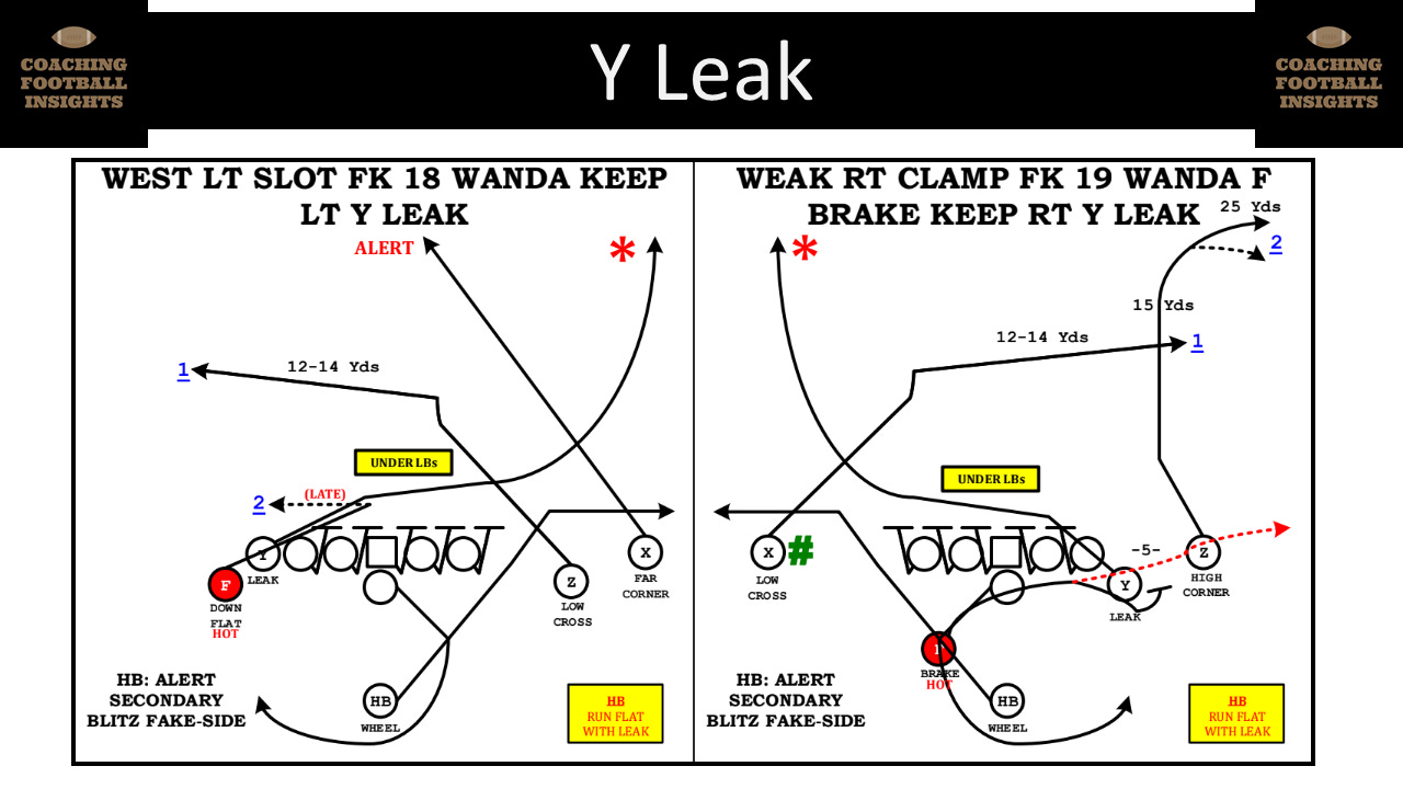The less you can change the initial scheme the better. Installing a new play is expensive and time-consuming, so having tags off your base plays that only change 1 assignment is a great way to layer your system without burdening all 11 players. That’s what we are going to look at today with Y Leak.